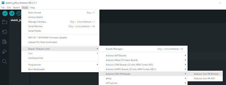 Nun finden wir unter dem Pfad „Tools > Board:xyz > Arduino UNO R4 Boards“ das Board „Arduino Uno R4 Minima“.