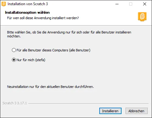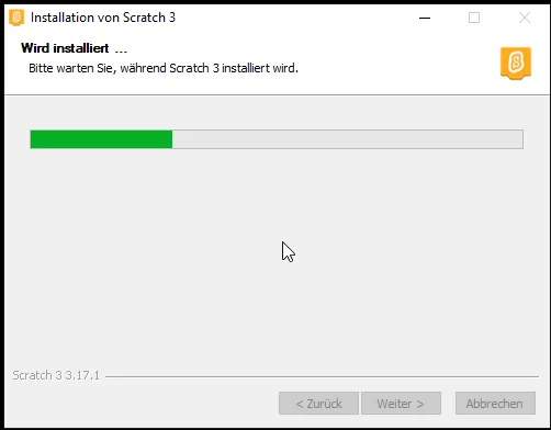 Der Wizard zum installieren von Scratch ist in 3 Fenster aufgebaut und bedarf keiner besonderen Rechte während der Installation.