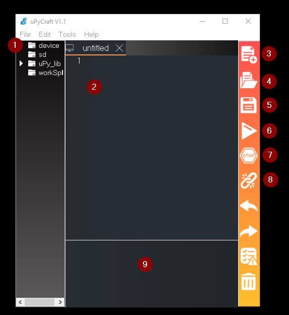 Die Oberfläche der Anwendung uPyCraft ist sehr einfach gehalten, quasi auf das wesentliche beschränkt, aber trotzdem sehr mächtig.