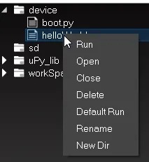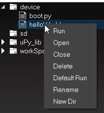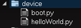 Ich habe bereits ein Programm hochgeladen, somit existiert neben der wichtigen „boot.py“ zusätzlich die Datei „helloWorld.py“.