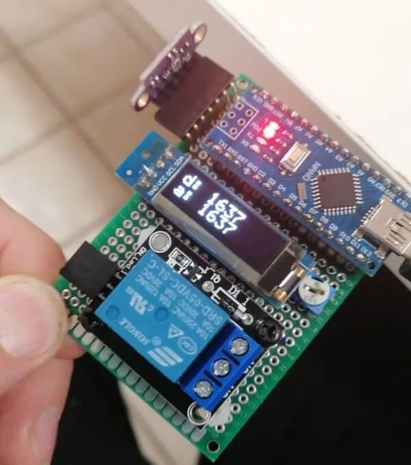 Ich habe zusätzlich noch zwei LEDs verbaut, welche den Status anzeigen, zum einen, ob das Relais aktiviert ist und die Schaltung (bzw. der Arduino Nano) Strom hat.