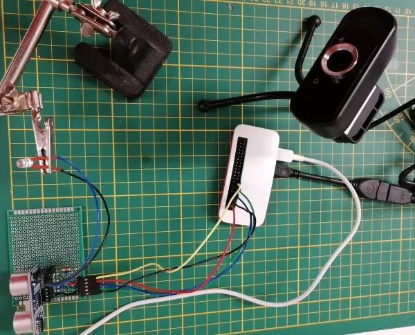 Der erste Aufbau war ein einfacher Ultraschallabstandssensor vom Typ HC-SR04 mit einer USB Webcam am Raspberry Pi Zero 2 W.