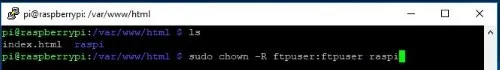 Damit der Benutzer auf das Verzeichnis zugreifen kann, müssen diesem nun noch explizit die Berechtigungen geben werden. D.h. auf der Kommandozeile wird der Befehl „sudo chown -R ftpuser:ftpuser raspi“ ausgeführt, wobei „raspi“ der Verzeichnisname ist.