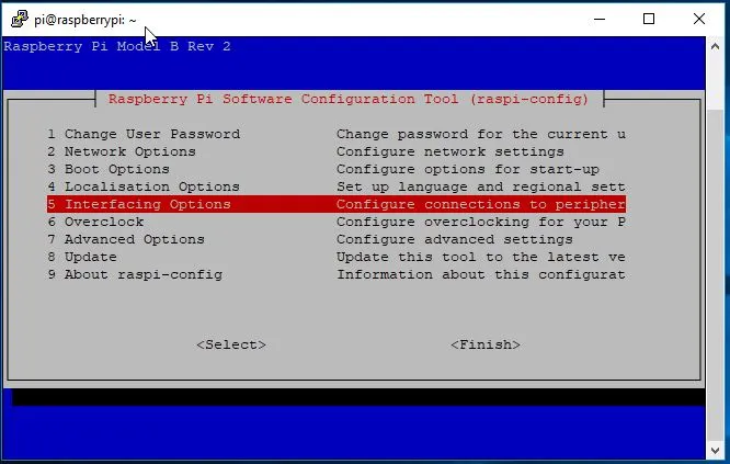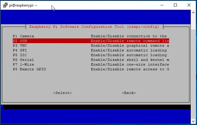 Es wird nun mit dem Befehl „sudo raspi-config“ die Konfiguration des Raspberry PI geöffnet und dort wie folgt SSH aktiviert.