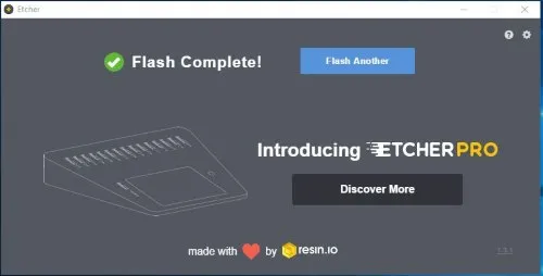 Nachdem das Programm Etcher heruntergeladen und installiert wurde, wird das zuvor entpackte Image von Rasbian ausgewählt und mit der Schaltfläche „Flash!“ wird der Vorgang gestartet.
