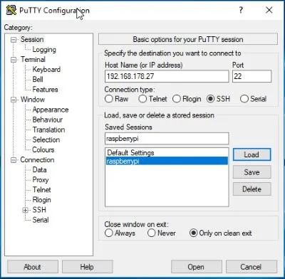 Hat man die IP-Adresse gefunden so wird diese in der Putty Konfiguration eingegeben.