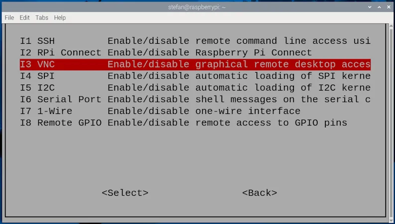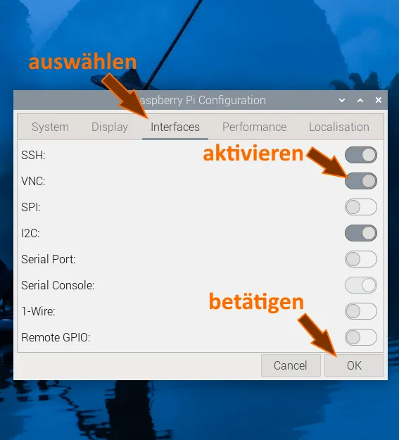 Wenn du einen Monitor, Maus und Tastatur direkt am Raspberry Pi angeschlossen hast, kannst du VNC ganz bequem über das Tool „Raspberry Pi Configuration“ aktivieren. Dort findest du die Option unter dem Reiter „Interfaces“, wo du den VNC-Server mit einem Klick einschalten kannst.