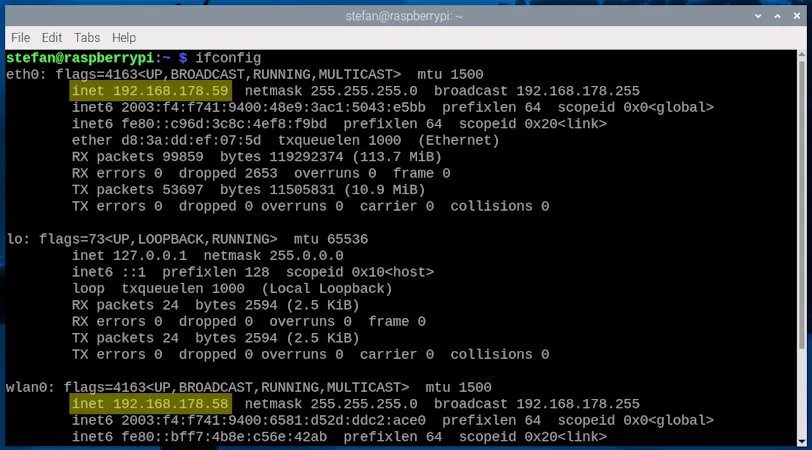 Der schnellste Weg – besonders, wenn du direkt am Pi arbeitest oder per SSH verbunden bist – ist der Befehl: bashKopierenBearbeitenifconfigIn der Ausgabe findest du unter dem Abschnittwlan0(WLAN) odereth0(LAN) die Zeileinet, z. B.:inet 192.168.178.59– das ist deine IP-Adresse im Heimnetz.