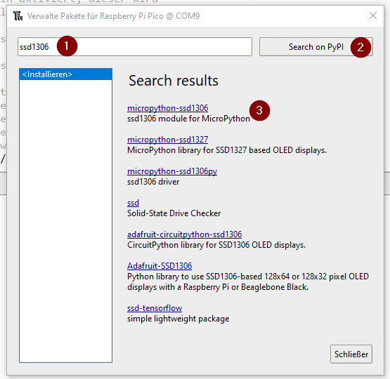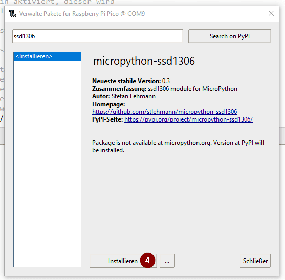 Im ersten Dialog suchst zunächst mit dem Schlagwort „ssd1306“ (1) auf der Seite PyPI (2) in der Ergebnisliste wählst du dann den Hyperlink im ersten Eintrag (3) aus. Im neu geöffneten Dialog wählst du dann nur noch die Schaltfläche „Installieren“ (4) und die Bibliothek ist installiert.