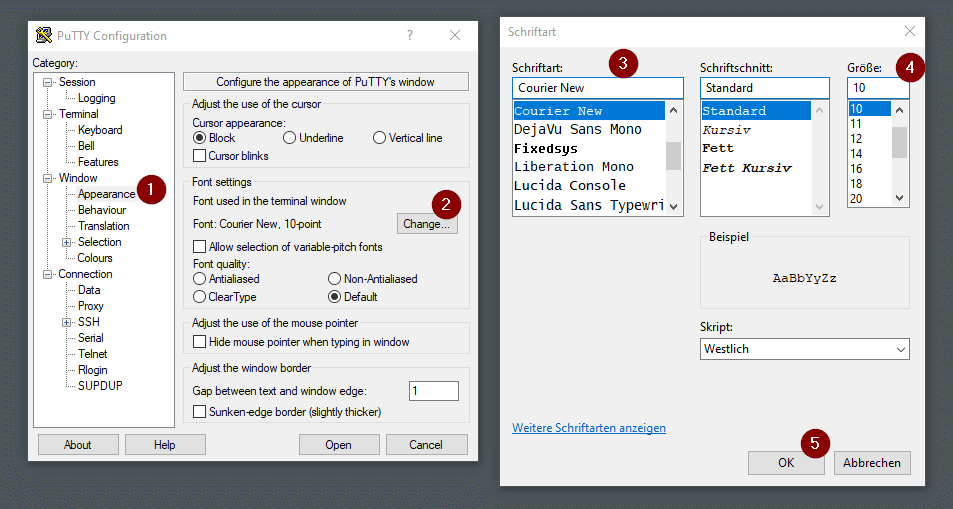 Ein Vorteil von Putty ist, dass sich das Terminalfenster sehr leicht konfigurieren lässt. Unter den Einstellungen kannst du zum Beispiel die Schriftgröße und Schriftart anpassen.