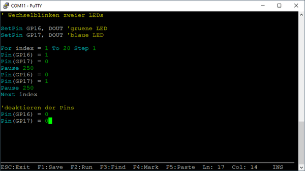 Wie man eine LED in BASIC programmiert, hatte ich bereits in meinem ersten Beitrag gezeigt. Hier nun der Code um die beiden LEDs abwechselnd im Intervall von 250 ms. Blinken lässt.