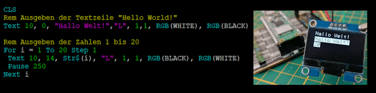 Der Basic Befehl für die Ausgabe von Text lautet „Text“ und hat die Parameter: