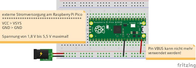 Anlegen einer externen Spannungsversorgung an den Raspberry Pi Pico via VSYS