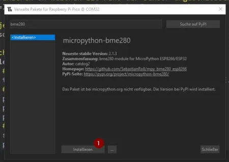 Zunächst suchen wir nach „bme280“ und wählen aus den Suchergebnissen den Eintrag „micropython-bme280“ aus und wählen im nächsten Schritt die Schaltfläche „Installieren“ (1) aus. Nachdem das Modul installiert wurde kann der Dialog über die Schaltfläche „Schließen“ (2) verlassen werden.