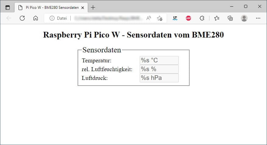 html = '<!DOCTYPE html PUBLIC "-//W3C//DTD XHTML 1.1//EN" "http://www.w3.org/TR/xhtml11/DTD/xhtml11.dtd"><html><head><title>Pi Pico W - BME280 Sensordaten</title><style>h1{text-align:center;font-size:28px;}fieldset{width:340px;margin:0 auto;}label {width:190px;display:inline-block;}input[type=text]{width:120px;}input[type=text], label{font-size:20px;}legend{font-size:26px;}</style></head><body><h1>Raspberry Pi Pico W - Sensordaten vom BME280</h1><fieldset><legend>Sensordaten</legend><label for="temperaturText">Temperatur: </label><input type="text" value="%s ℃" id="temperaturText" disabled=disabled/><br/><label for="luftfeuchtigkeitText">rel. Luftfeuchtigkeit: </label><input type="text" value="%s %" id="luftfeuchtigkeitText" disabled=disabled/><br/><label for="luftdruckText">Luftdruck: </label><input type="text" value="%s hPa" id="luftdruckText" disabled=disabled/><br/></fieldset></body></html>'