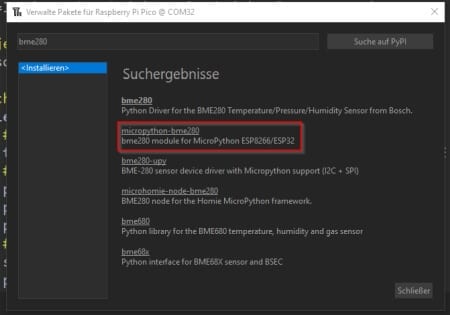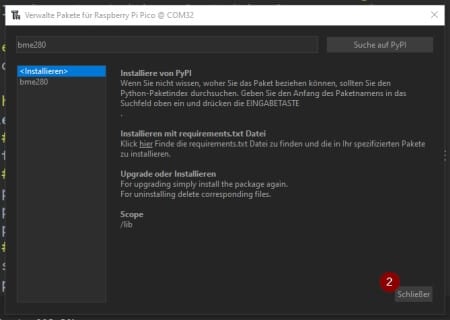 Zunächst suchen wir nach „bme280“ und wählen aus den Suchergebnissen den Eintrag „micropython-bme280“ aus und wählen im nächsten Schritt die Schaltfläche „Installieren“ (1) aus. Nachdem das Modul installiert wurde kann der Dialog über die Schaltfläche „Schließen“ (2) verlassen werden.