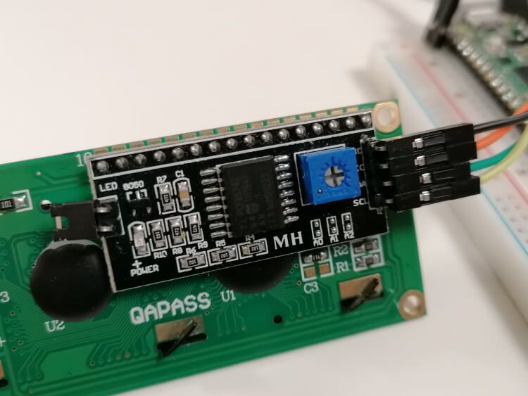 Das verwendete LCD-Display hat einen kleinen I²C Adapter auf der Rückseite verbaut. Dieser Adapter verfügt über die Pins SDA, SCL, VCC und GND sowie über einen Drehpotentiometer (blaues Bauteil im Bild) über welchen die Helligkeit der Schrift gesteuert werden kann.