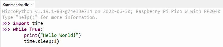 Dazu klicken wir im unteren Bereich der Thonny IDE in die „Kommandozeile“ und geben nachfolgendes Skript ein.