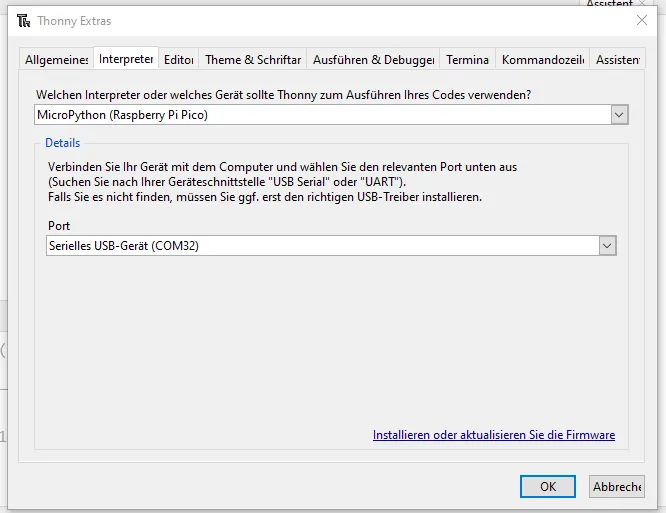 Im neuen Dialog „Thonny Extras“ sollte der Reiter „Interpreter selektiert und geöffnet sein. Aus der Auswahlliste müssen wir dann den Eintrag „MicroPython (Raspberry Pi Pico)“ auswählen sowie den Port.