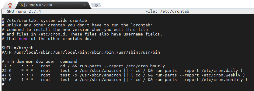 Zur CronTab gibt es ein sehr guten Wiki Artikel unter https://wiki.ubuntuusers.de/Cron/, in diesem Abschnitt möchte ich gerne zeigen wie du einen Eintrag erstellst welcher einen Befehl alle 5min. ausführt.
