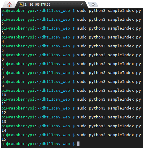 Wenn wir nun auf der Konsole das Python Skript „dht11.py“ aufrufen, wird eine Messung durchgeführt und gespeichert, danach beendet sich das Programm von alleine.