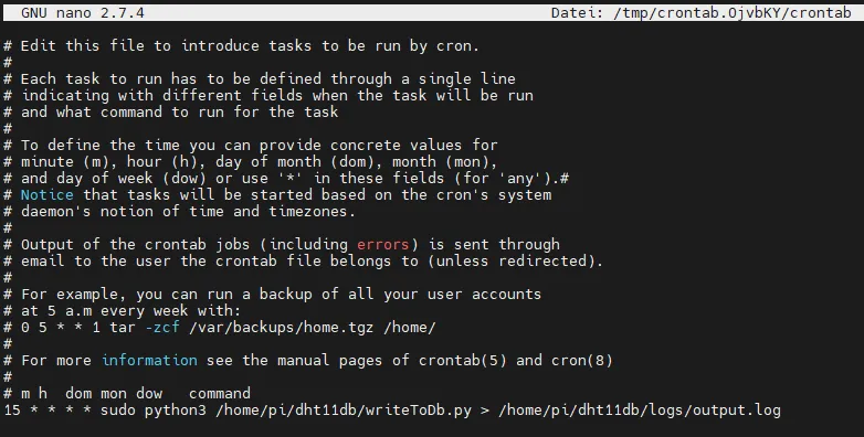 15 * * * * sudo python3 /home/pi/dht11db/writeToDb.py > /home/pi/dht11db/logs/output.log