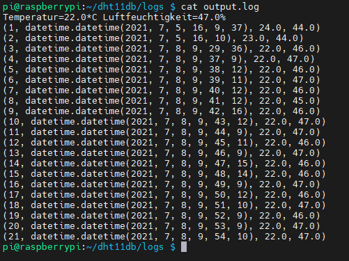 Die Ausgabe des Skriptes wird nach „/home/pi/dht11db/logs/output.log“ geschrieben, d.h. die Ausgabe mit dem Befehl „print“ aus dem Skript werden in diese Datei geschrieben, des Weiteren werden auch eventuelle Exceptions / Ausnahmen in diese Datei geschrieben.