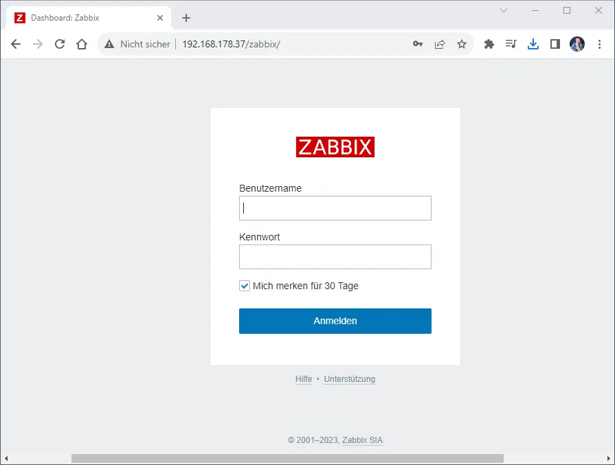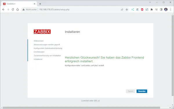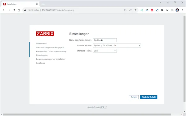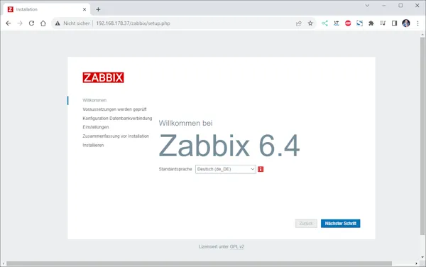 Nachdem die Installation & Konfiguration abgeschlossen ist, können wir das Webfrontend über http://<IP-Adresse>/zabbix öffnen.