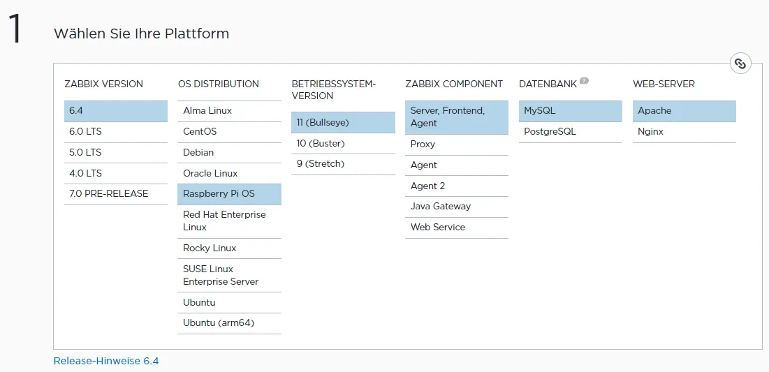 Die Installation von Zabbix ist sehr einfach, denn über der Seite https://www.zabbix.com/de/download kann man sich die benötigten Befehle erstellen lassen. Zunächst wählt man die Version, welche man installieren möchte und danach die Konfiguration des Raspberry.