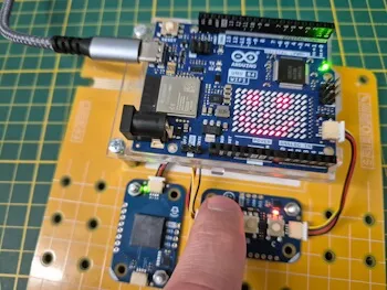 Für dieses kleine Spiel müssen wir lediglich das Button Modulino Shield mit einem Qwiic Kabel mit dem Mikrocontroller verbinden. Mit den Schrauben wird das kleine Modul auf der Modulino Base geschraubt und somit sind wir auch schon fertig mit dem Aufbau.