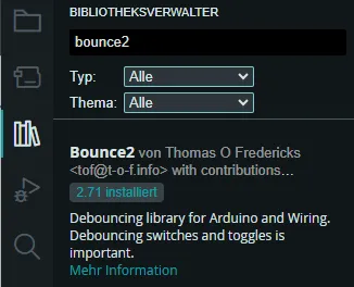 Für die Programmierung in der Arduino IDE benötigen wir neben dem Boardtreiber für den UNO R4 WiFi und Bibliothek für die LED Matrix noch Bounce2. Über Bounce2 können wir recht einfach die verbundenen Taster entprellen.