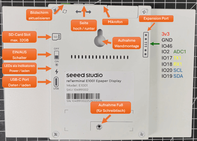Um den Einstieg zu erleichtern, habe ich eine Grafik erstellt, in der alle wichtigen Anschlüsse, Tasten und Sensoren des reTerminal E1001 markiert sind. So siehst du auf einen Blick, wo sich welche Komponenten befinden.