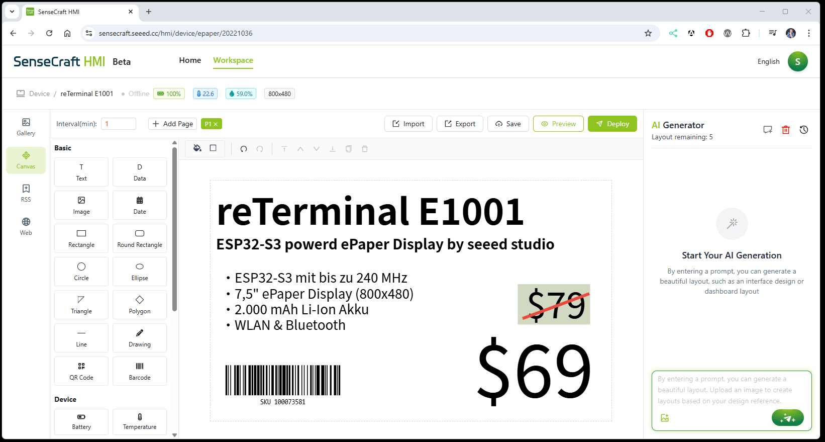 Die KI generiert daraufhin automatisch ein komplettes Layout, das direkt auf dem reTerminal E1001 angezeigt werden kann.