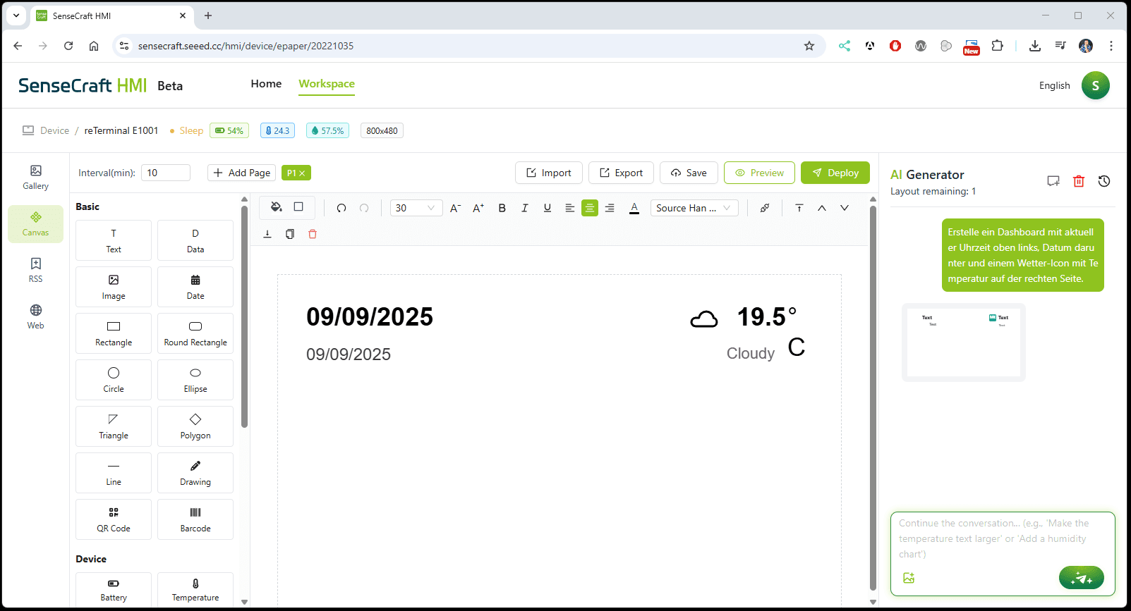 Eine Besonderheit von SenseCraft HMI ist der integrierte KI-Assistent. Anstatt alle Elemente manuell im Editor zu platzieren, kannst du dem Assistenten einfach einen Prompt geben – also in Worten beschreiben, wie dein Layout aussehen soll.