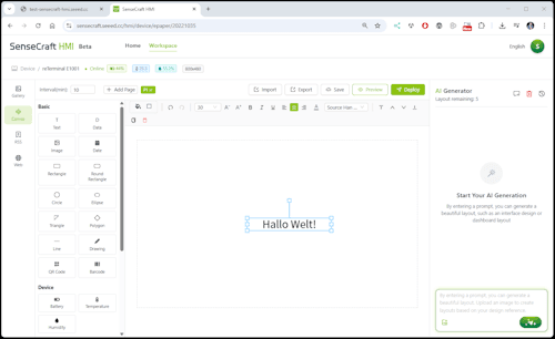 In SenseCraft HMI kannst du dazu ein neues Projekt anlegen und ein Textfeld auf die gewünschte Position ziehen. Anschließend wird der Text „Hallo Welt!“ eingetragen und das Projekt auf das reTerminal übertragen. Nach kurzer Synchronisation erscheint der Schriftzug direkt auf dem Display – ein perfekter Test, dass die Verbindung und die Firmware korrekt arbeiten.