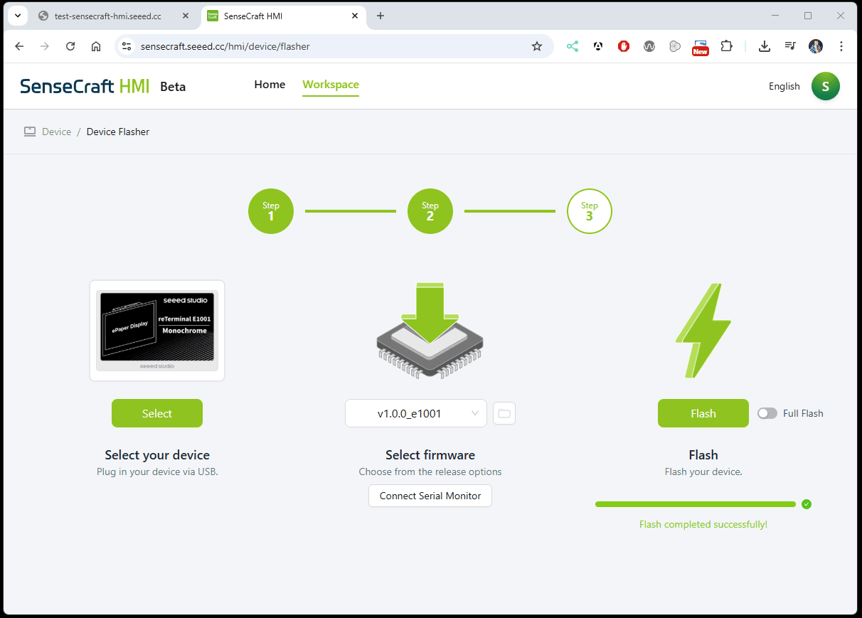 Der Flash-Vorgang läuft direkt im Browser und dauert nur wenige Minuten. Nachdem ich die Version v1.0.0_e1001 installiert hatte, konnte ich die Verbindung endlich erfolgreich aufbauen und das Gerät in SenseCraft HMI einbinden.