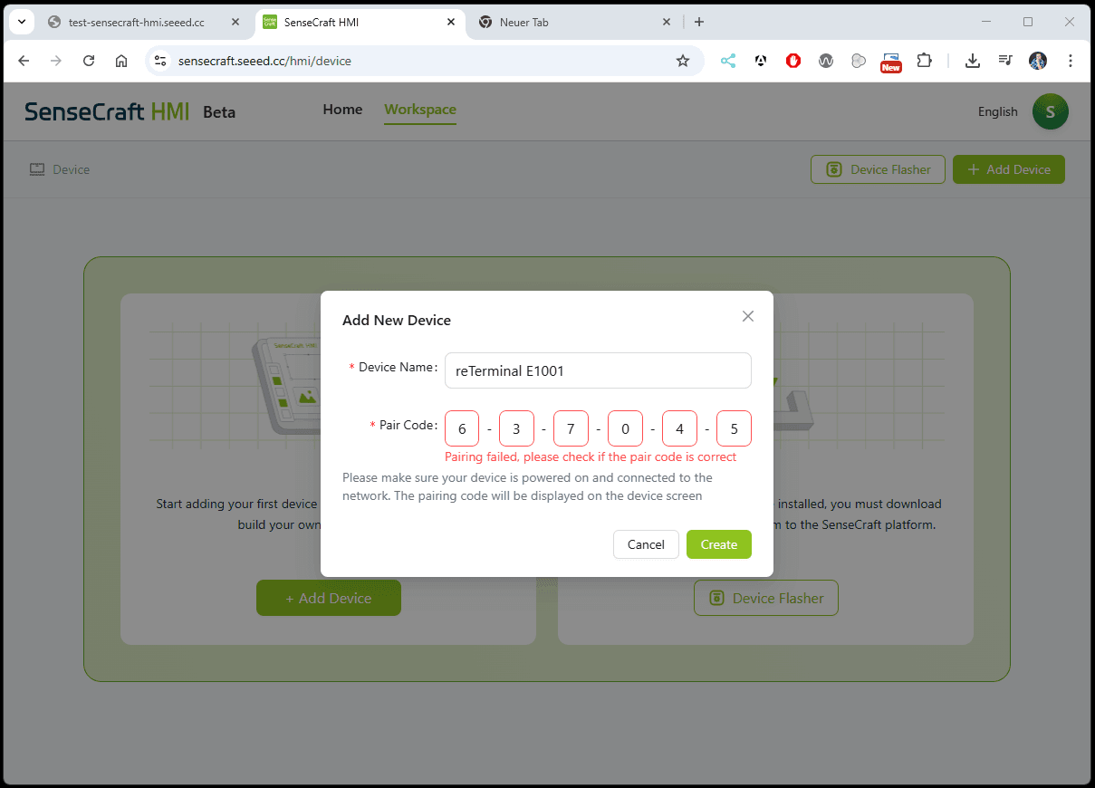 In meinem Test war diese Seite jedoch nicht erreichbar. Als Alternative habe ich es über https://sensecraft.seeed.cc/hmi/device versucht – allerdings ließ sich das Gerät auch dort nicht erfolgreich einbinden.