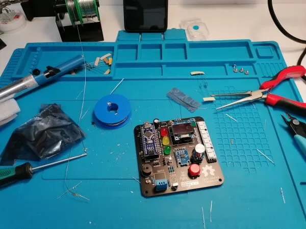 Der Funduino-Cube ist eine Platine mit vielen Sensoren und Aktoren, welche mit einem Arduino Nano V3 (im Lieferumfang enthalten) programmiert werden kann. Bevor jedoch mit der Programmierung begonnen werden kann, muss diese zusammengelötet werden.