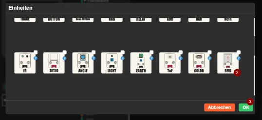 Als erstes müssen wir auf das große „+“ Zeichen links unten mit der Beschriftung „UNITS“ klicken (1) , danach öffnet sich ein neuer Dialog in welchem wir etwas nach unten scrollen müssen um dann auf der rechten Seite die UNIT „RFID“ markieren (2) und diese auswahl mit der Schaltfläche „OK“ (3) bestätigen.