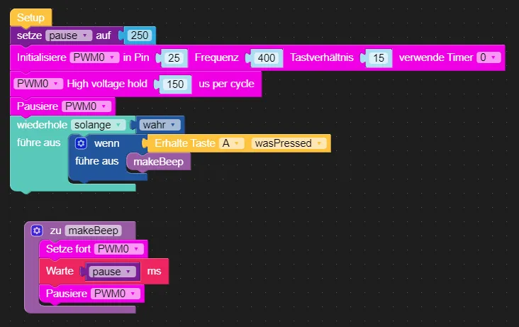 Wenn der Taster gedrückt wurde, wird die Funktion „makeBeep“ ausgeführt in welcher