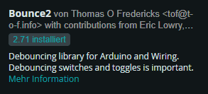 Für das Auswerten des Tasters verwende ich zusätzlich die Bibliothek Bounce2. Diese wird benötigt um den Taster zu entprellen.