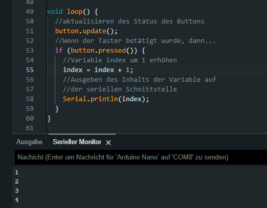 Wenn man jetzt auf den Taster drückt, dann wird über die serielle Schnittstelle der Inhalt der Variable index ausgegeben.