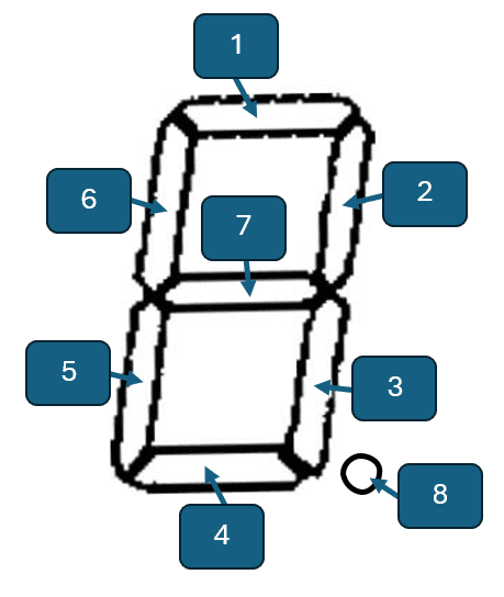 Für die Anzeige eine Zahl muss eine LED in der 7 Segmentanzeige aktiviert werden. Dazu wurde ein 8-stelliges Array angelegt, in welchem eine 1 eine aktive LED und eine 0 eine entsprechend deaktivierte LED repräsentiert.
