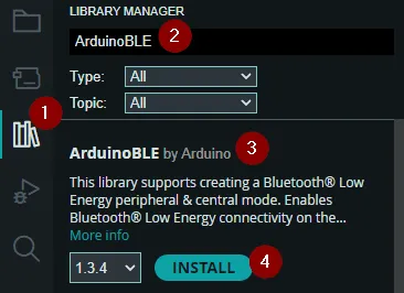 Zusätzlich benötigen wir die Bibliothek Arduino BLE, welche wir über den internen Bibliotheksverwalter der Arduino IDE installieren können.