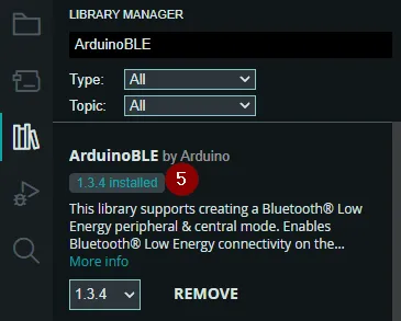 Im Bibliotheksmanager (1) suchen wir zunächst nach „ArduinoBLE“ (2), am gefundenen Eintrag „ArduinoBLE by Arduino“ (3) wählen wir die Schaltfläche „INSTALL“ (4). Wenn die Installation erfolgreich war, dann siehst du dieses an dem Lable „<Versionsnummer> installed“ (5).