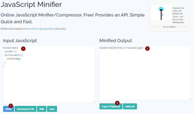 Zunächst fügt man das Script in das Feld „Input JavaScript“ (1) ein und betätigt danach die Schaltfläche „Minify“ (2) nach einem kleinen Augenblick wird der minimierte Text im Feld „Minified Output“ (3) dargestellt und kann über die Schaltfläche „Copy to Clipboard“ (4) in der Zwischenablage abgelegt werden.