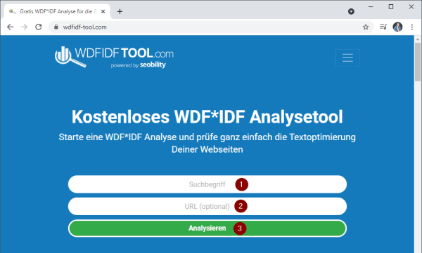 Auf der Seite findest du ein recht einfaches Formular in welches du dein Suchbegriff / Keyword (1) , deine URL (2) eingibst und dieses mit der Schaltfläche „Analysieren“ (3) bestätigst.