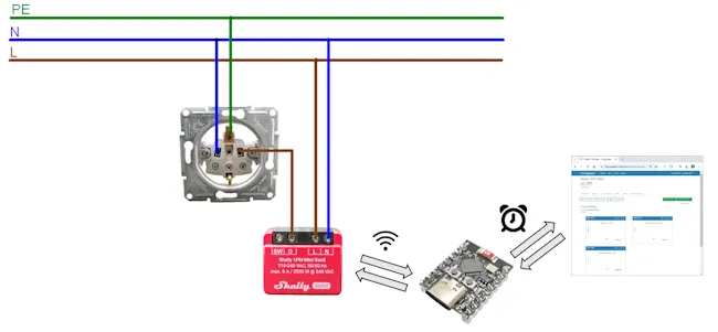 - Aufbau der Schaltung mit einem Shelly 1PM Mini Gen3 und ESP32-C3 Mini