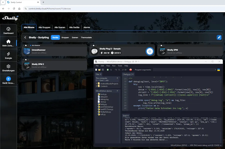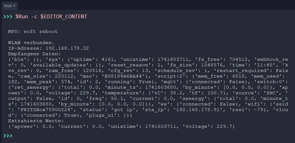 Um die Daten des Shelly 1PM auf dem ESP32-C3 speichern zu können, muss zunächst eine Verbindung zum Gerät hergestellt und der JSON-Response über die bereits erwähnte REST-Schnittstelle abgerufen und ausgewertet werden. Die Umsetzung ist sowohl mit der Arduino IDE als auch mit MicroPython möglich. Da das Dateihandling in MicroPython deutlich einfacher und übersichtlicher ist, habe ich mich in diesem Projekt für diese Variante entschieden.
