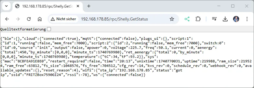 Mit dem Aufruf http://<IP-Adresse>/rpc/Shelly.GetStatus lässt sich der aktuelle Status des Shelly als JSON abrufen. Das JSON-Format ist dabei sowohl für Menschen gut lesbar als auch leicht von einem Mikrocontroller zu verarbeiten. Zudem gibt es keine Begrenzung bei der Abrufhäufigkeit, sodass die Daten theoretisch sogar im Sekundentakt abgefragt werden können.